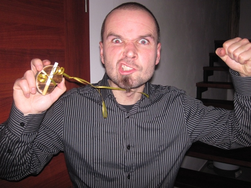 Kroky (nikoli však Františka Janečka) mne vedou podél řeky Labe přes Kostelec, hopsa hejsa do Brandejsa, probzučet Č(m)elákovice, mihnout se kolem Lysé a pak už jen nekonečně krásný, svěží vzduch borových lesů po dešti v Kersku. U přátel po rychlé sprše vyslechnu povinné litanie á la Co jsi to za magora?! a z rukou nejsličnější přítomné přebírám medaili pro vítěze. Vlastnoručně vyřezávaná, dřevěná, krásná. A jediná. Taková je. Medaile. A je k ní přimknuta i opravdová marlborka pro relaxaci plicních sklípků! Hurá!!! Pod stromečkem následně nalézám běžecké kompresní návleky a sportovní osušku v nádherné červeno-bílé kombinaci. Podle dalších darů to vypadá, že si mne (tou dobou již patrně značně nepříčetný) Běžíšek zařadil do kategorie hodných hochů. Mno, možná se mi podařilo vlichotit se do jeho přízně svým neotřelým způsobem oslavy jeho příchodu na svět. Příští rok to asi zkusím zas. Ono se to fakt rentuje.