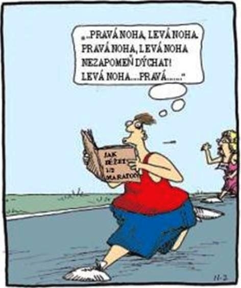 TO bylo ONO!!! ZAČÍT BĚHAT! Už žádné výmluvy. Pokud chci, tak také začnu. První krůček k novému cíli byla registrace na půlmaraton. Důvodem, proč zrovna půlmaraton, byla i sázka s kamarádem. Když bych náhodou zaběhla lepší čas, tak by on přestal kouřit. Jenže kamarád je o miliardu let mladší a na jeho zhuntované plíce spoléhat nemůžu. Uvědomila jsem si, že potřebuji někoho, kdo mi pomůže s trénováním. S během mám mizivé zkušenosti. Několik pokusů na Petříně vždycky skončilo pocitem „Jde to, ale dře to“. Kondička ze spinningu nestačí. Běhání sice vypadá jednoduše, ale tak nějak víc bolí. Nastudování trošky teorie nepomohlo. Naopak – po přečtení pár článků na internetu jsem začala mít pocit, že už ani nevím, jestli umím správně chodit.