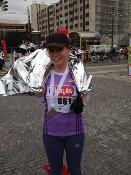 Je tu patnáctý kilometr. Odteď už orloj ignoruji. Myslím, že ani kdyby se na něm objevil Miloš se zdviženým ukazovákem, tak mě nezastaví. Běžím, co to dá, doháním kolegu za salvy dalších SMSek a běžím za co nejlepším umístěním týmu. Konečně koukám na hodinky, ale protože si netroufám na nich něco přepínat, vůbec netuším, na jaký čas to vlastně běžím. Ale už je tu modrý koberec, po tom se vždycky běží nejlíp, a já jsem v cíli. Odvažuji se zmáčknout čudlík a zalévá mě nádherný pocit. Čas, na který jsem se ani neodvážila pomyslet. 1:44:34. Hned mě napadá, že jsem snad klukům neudělala ostudu. Hledám očima známe tváře a už jsou tu. Pomalu se vynořují z šaten, fólií a tisíců neznámých obličejů. Moji kluci a moje holky. Zvláštní pocit, být součástí těchto skupin. Každá pro mě něco znamená. Jednu jsem pomohla vytvořit a do jedné jsem byla vybrána. Nemohu říct, ke které mám blíž, ale obě mě pohltily a oběma patřím. Dala jsem ze sebe všechnu energii a o její návratnost... jsem stoprocentně přesvědčena.