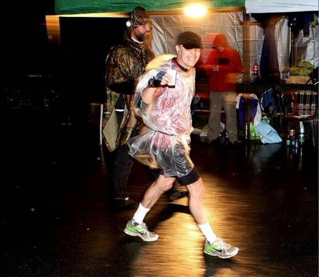 Déšť začíná být už otravný. Nechtělo se mi pařit se v pláštěnce, pořád jsem doufal, že to bude jen chvilková záležitost. Taková malá přeháňka. A tak moknu akorát ve vestě už asi pět hodin. Konečně někdy po sedmé se mraky na chvíli roztrhají a já se jdu s důvěrou v lepší příští přebalit do suchého. Okupuji malou šatničku před sprchou a záchodem, je tu i dřevěná lavice a věšáky, teď jsem za ně vděčný. Rozvěsit mokré věci a posadit se aspoň na chvíli, než co si člověk přezuje mokré boty. Mokré ponožky letí kamsi do kouta, scvrklé nohy připomínají růžové žužu. Chvíli koukám na tkaničky, jako bych je viděl úplně poprvé, než mi dojde, že si ty věci budu muset zavázat. V duchu děkuji Štefanovi, který mě kdysi dávno naučil nosit startovní číslo připnuté na gumě kolem pasu. Čtyři sichrhajcky by byly nad mé síly. Takhle stačí stáhnout gumu někam ke kolenům, prohodit vrstvy v horních patrech, gumu pošoupnout pod bradu a nerušeně se věnovat přízemí. Mokré kalhoty dolů, v tlusté vrstvě na sebe patlám vrstvy lékařské vazelíny. Suchá kšiltovka jako vrchol luxusu. Už mě otravovalo koukat na kapky deště permanentně kanoucí z kšiltu dolů. Ale nejsem až zase takový optimista, abych nechal pláštěnku zase v tašce. Chvíli váhám nad schody od zázemí, ale stačí trocha ručkování po dolů klandru a můžu opět závodit. Znovu se rozprší asi deset minut poté, co jsem se vrátil na trať.