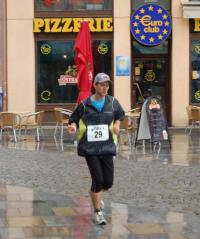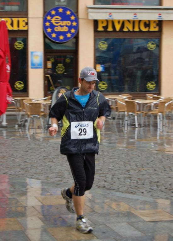 Po 35. kilometru si vzpomínám na Milošovu radu napsanou kdysi na webu, že teď už se maratonec nemusí bát to „rozbalit“. No jo, ale kde na to vzít sílu. Je tu poslední kolo a začínám pomalu některé běžce předbíhat. Z některých z nich se stávají spíše chodci, jedna běžkyně má i s chůzí problémy, trápí ji silné křeče. Magnesium jsem už spolykal, mohu jí nabídnout jen zbytek ionťáku, snad jí trochu pomohl. Obdivuji 81-letého borce, kterého sice předbíhám o kolo, ale v tomto věku … Klobouk dolů. Nohy sice bolí čím dál víc, ale vidina blízkého cíle mě žene kupředu, takže tempo stále držím. Na posledních dvou kilometrech jsem ještě 2 běžce předběhl, posledních pár set metrů, blíží se Masarykovo náměstí, kde je slyšet hudba, hlas v reproduktoru a před sebou vidím ještě jednoho staršího běžce. Pokouším se zrychlit, abych ho dohnal, ale asi si dobře rozvrhl síly, když za sebou slyší mé funění a dusot, zrychluje rovněž a už ho nestihnu. Nevadí, je tu cílová brána, ruce letí ve vítězném gestu nahoru, čas 4:31:10, dostávám od pořadatelů malý pohár na památku (je určen pro všechny závodníky) a láhev s energetickým nápojem. Únava se mísí s radostí, chodím, rodina gratuluje, běžím se indiánským během asi kilometr do šaten převléci a pak rychle do auta a domů, kde teplá vana tak dobře chutná ...