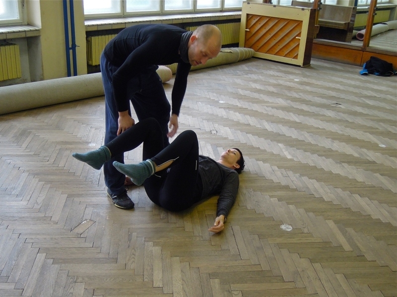 Jako správní „studenti“ všichni prošli malým testem, zda pochopili, jak postoj a držení těla ovlivňuje pro život důležité dýchání. Test spočíval ve cviku, kdy se každý posadil na lavici se správným držením těla a dýcháním nosem do břicha. Pak nastala změna, kdy se provedla pronace chodidel a dlaní (vnitřní rotace), což jasně demonstrovalo, jak téměř nemožné je se nadechnout. Posléze se cvik zopakoval, jen v podobě supinace chodidel a dlaní (vnější rotace). Ani v tomto okamžiku nebylo vůbec snadné se nadechnout.