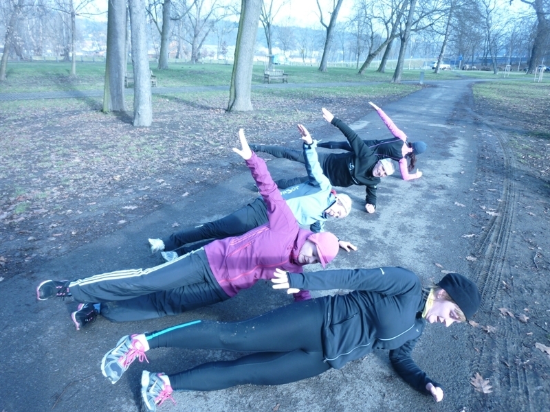 Najednou nás Miloš zastavuje a začíná nám předvádět jakési podivné prostocviky (Pistole; vzpor ala Patrick Makau; teď nevím, zda čáp nebo jiný pták, a další), které tůůůze bolí. Po návratu domů je nacházím zde. Terezka na nás z kočárku jen nevěřícně kouká. Ještě trošku proběhneme Stromovku, napucneme se šátečky a pomalu se loučíme. Vracíme se domů plni dojmů, nabiti do následujících dnů, ve kterých z príma setkání čerpáme.