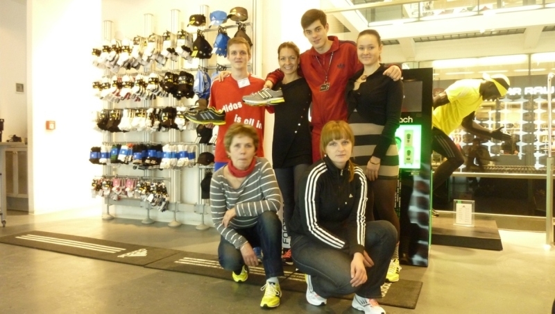Opět začínáme tím, že 2 hochům vysvětlujeme účel naší návštěvy. Cíl zjistit došlap (neutrál, pronace, supinace) a velikost obuvi. Kluci okamžitě rozkládají koberec vedoucí k plošině pro došlap. Postupně se rozebíháme a došlapujeme na desku. Vzhledem k mým operacím došlapuji na pravou nohu zcela jinak než na levou, musím směrem k plošině startovat min. 4x. Konečný výsledek: neutrální došlap. Pak ještě zkouším boty, pro jistotu dvoje, abych se ujistila ve velikosti. Ještě závěrečné společné focení se sestřičkami (tak si kluci prodavači říkali) a trošku vyčerpané vycházíme na ulici. Zde však nejsme dlouho, po pár metrech zaplouváme do Mekáče, kde si nad hranolkami, kafíčky a zmrzlinou povídáme o zdravé výživě a také o tom, kde která máme jaký špíček:-) Jsem šťastná mezi běžeckými blázny…